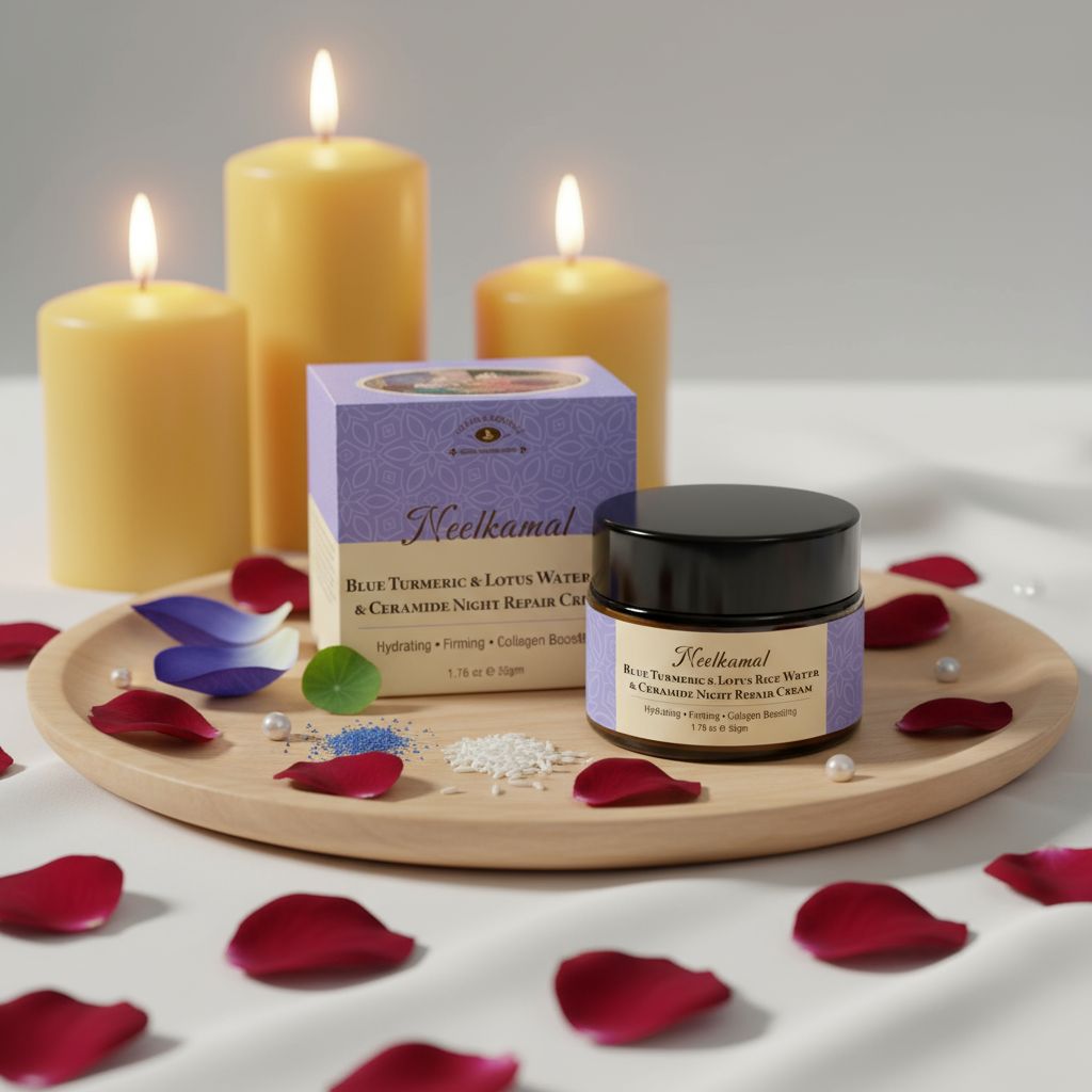 If you feel you have experienced a luxurious ceramide rice water elixir face cream, wait until you have tried the Herbs & Greens Blue Turmeric & Lotus Rice Water Ceramide Night Repair Cream. At Herbs & Greens we believe in visible results. You are what your skin is. A firm, bright, naturally lumicent skin is a dream for everyone but we seldom see what goes inside our cream. At Herbs & Greens we do not compromise on the quality of ingredients and naturally enhancing the beauty of your skin is our paramount goal. This Cream is a light advanced natural international luxury night repair cream with the essence of Blue Turmeric, Blue Lotus, bLUE Berries, Rice Water Extracts & Natural Plant Ceramides, besides a blend of ayurvedic anti aging herbs. Specially formulated for All Skin Types, Dull, Undernourished Skin that requires natural radiance, antioxidant night repair. This light non oily and non greasy night cream is perfectly suitable for both dry & oily skin. It does not clog skin pores thus safe for oily acne/pimple prone skin or those who have an oily T zone. It also promotes cell regeneration and is touted as being beneficial to aging skin. Blue Turmeric & Lotus are known to improve complexion. It also contains Rosemary which is very relaxing, calming, and warming & has toning and moisturizing properties. This cream penetrates completely inside the skin without any greasy texture to nourish from deep within. Ceramides in this cream maintain skins natural barrier thus enhance radiance, fight signs of aging by acting as antioxidants. The ulta luxury night cream is carefully crafted in small batches using the best natural plant base. Pamper your skin & naturally hydrate, tone & nourish the skin's deep 7 layers.