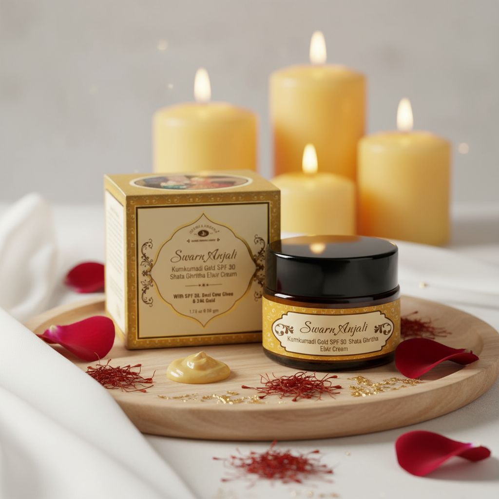 ✔ Ayurvedic Luxury Skincare – Infused with Kumkumadi Oil, Desi Cow Ghee & 24K Gold to nourish & rejuvenate skin.
